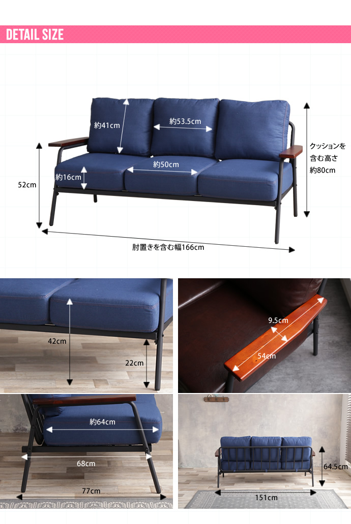 | 規格 | 【デニム】ウレタンフォーム・ポケットコイル・デニム・スチール 【PVC】ウレタンフォーム・ポケットコイル・PVC・スチール 肘置き:天然木 |